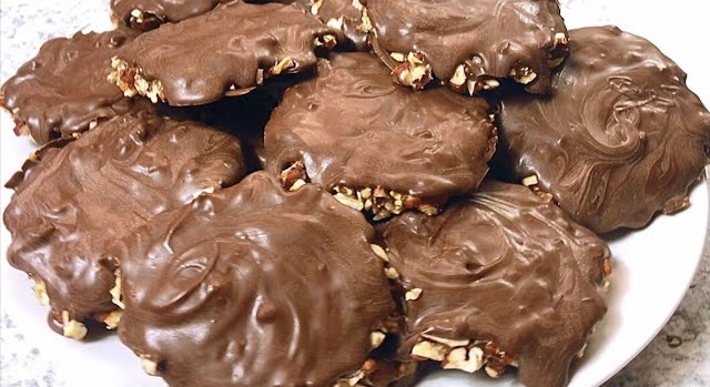 • Spoon about 1/2 tablespoon of melted chocolate over each caramel-pecan cluster.
