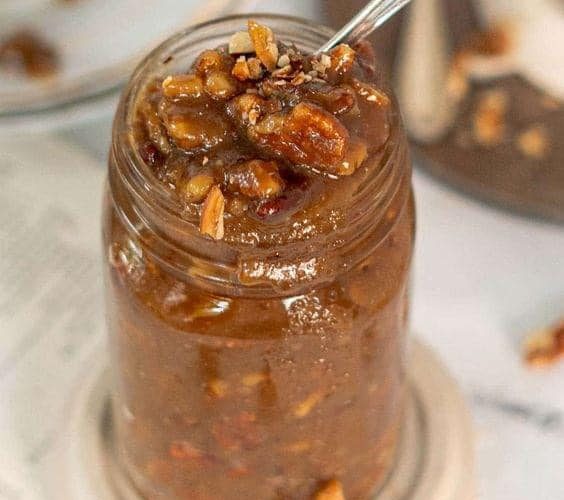 This recipe totally surprised me! No it’s not as dense as regular pecan pie because it doesn’t have butter, eggs and corn syrup, but I promise the taste is phenomenal.